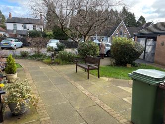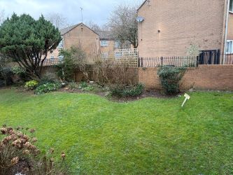 Outside Well-maintained communal lawned gardens with bordering shrubs and hedges with attractive planted areas and car park.