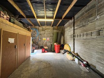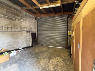 Detached Garage: Accessed via a roller shutter door with storage cupboards and pedestrian door to the side.