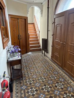 Ground Floor Side hallway. Front hallway with two staircases leading to the galleried area. 49’3” x 36’3” Chapel Auditorium with raised organ and pipes, Raised Pulpit/(Sedd Fawr). Meeting hall measuring 39’9” x 23’8” with doors to sub-divide the area. Boiler room & kitchen.
